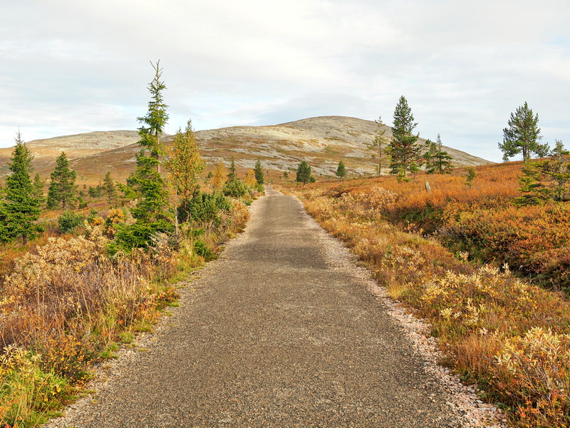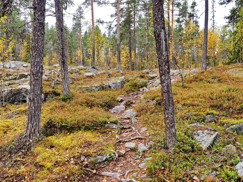 Zunächst auf einem breiten geschotterten Weg mit einigen Erklärungstafeln zur umgebenden Natur geht es bergauf. Am Berg links vom Weg kann man Skilifte erkennen, nicht nur in Levi, auch hier und an anderer Stelle im Nationalpark sind zahlreiche Skipisten.