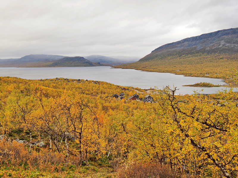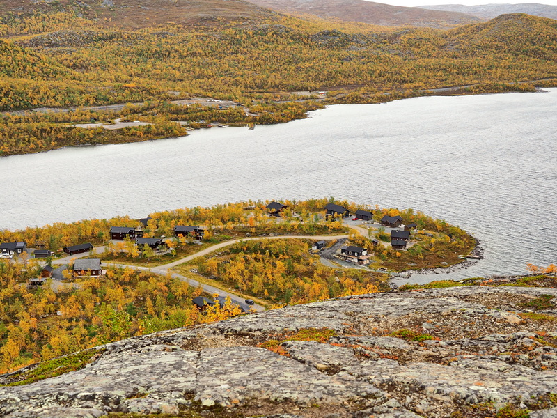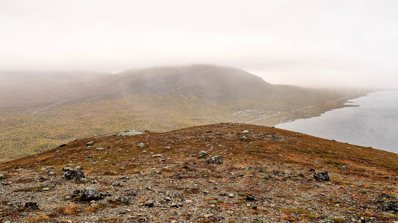Auch auf die verhältnismäßig vielen Hotels und sonstigen Ferienhäuser kann man gut blicken vom 595 m hohen Gipfel. Hier ist es anders als auf dem Pikku Malla einigermaßen angenehm temperiert und ich genieße den Aufenthalt und mache ausführlich Fotos in alle Richtungen. Trotz des Wetters bedauere ich es, dass ich Kilpisjärvi morgen schon wieder verlassen muss.