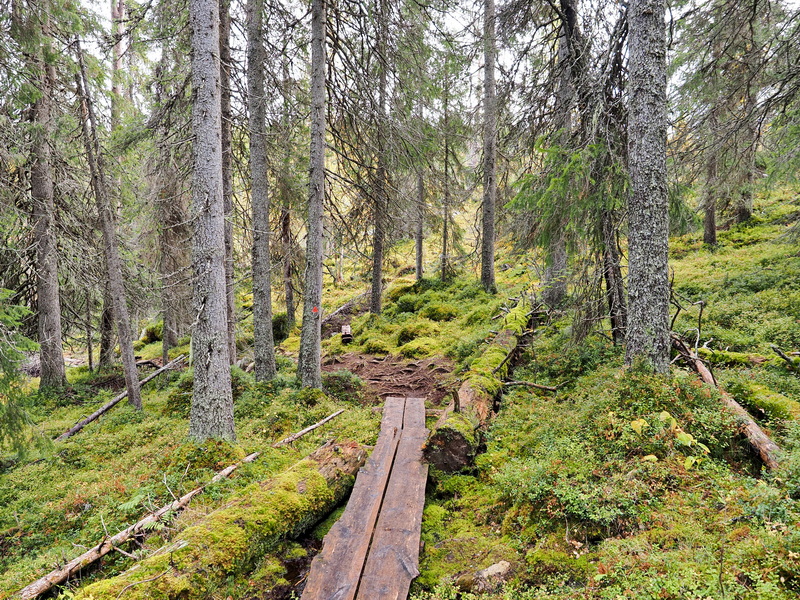 Ungefähr eine Stunde nach dem Start erreiche ich den Abzweig zum Pikku Malla. Ich überlege, ob ich auf diesen Gipfel wandern soll oder noch weiter dem Weg zum Dreiländerpunkt folgen, es gäbe mit einem Wasserfall ein möglicherweise erreichbares Zwischenziel bzw. Umdrehpunkt.