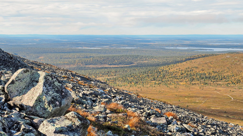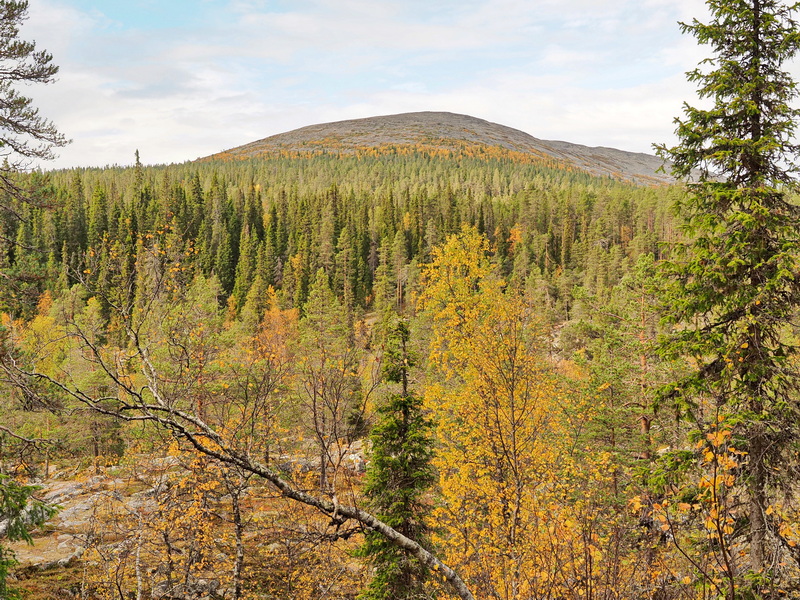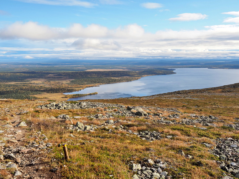 Sie beginnt nicht weit von der Unterkunft und führt auf kurzem aber knackig steilem Weg hinauf auf den Salmivaara. Auch auf dieser Wanderung sind die Ausblicke fantastisch, der Saanatunturi ist nun völlig wolkenfrei (wie auch schon gestern Abend bei meiner Wanderung zum See und den Wasserfällen), vielleicht wäre ein Aufstieg dorthinauf ab dem späten Nachmittag doch sinnvoll möglich gewesen, ich weiß es nicht.
