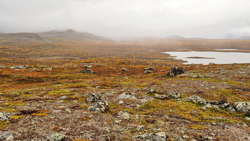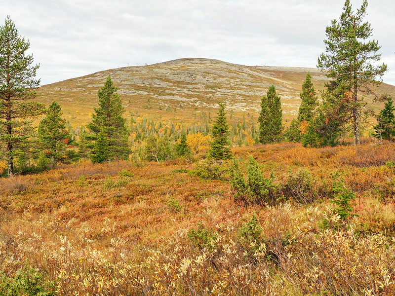 Auf den Saanatunturi zu wandern ist heute sinnlos, man sieht wie Wolken und Nebel die obere Hälfte einhüllen, die Aussicht wäre gleich Null. Es sind auch keine Wanderer auf dem im unteren Bereich gut zu sehenden Pfad erkennbar.