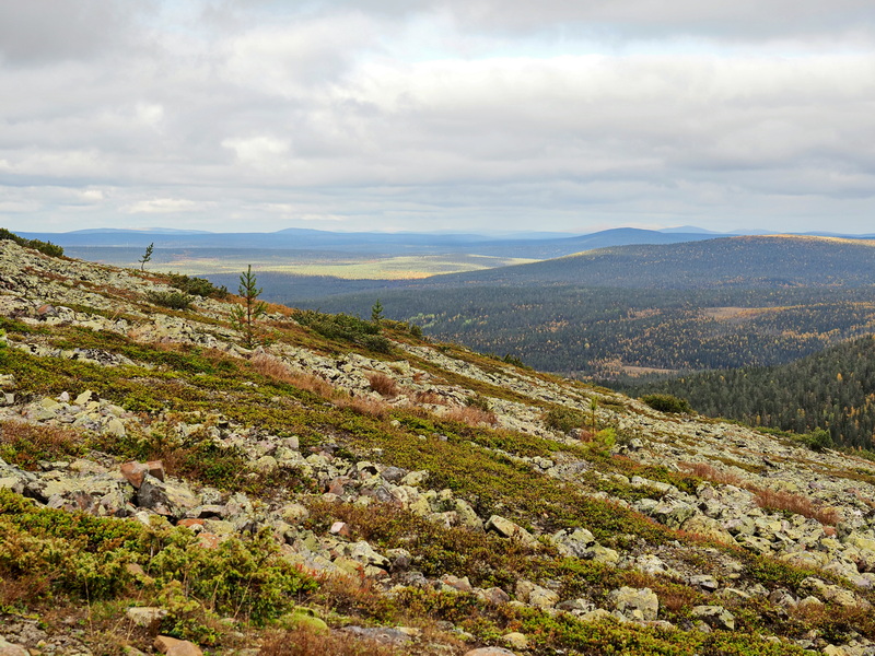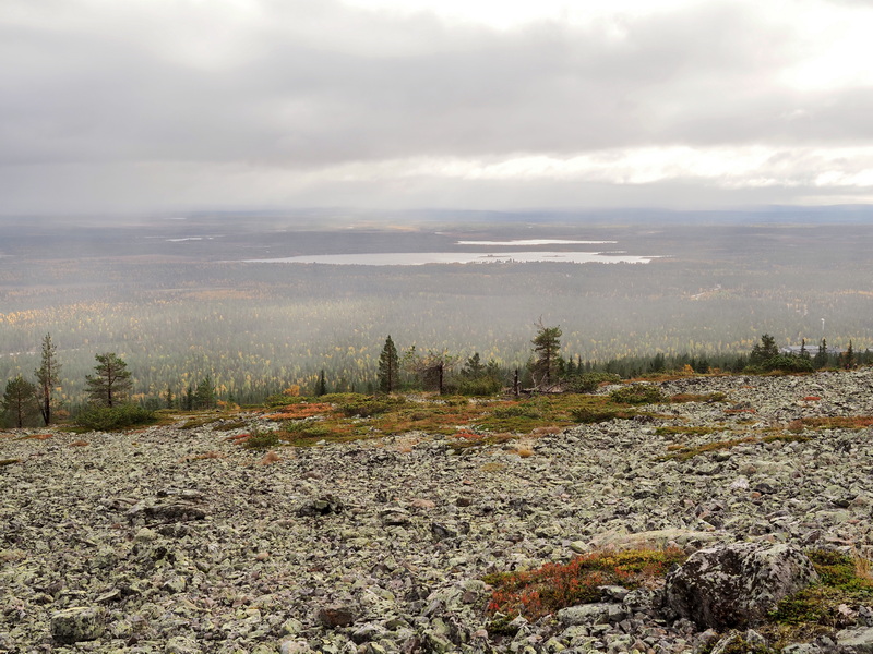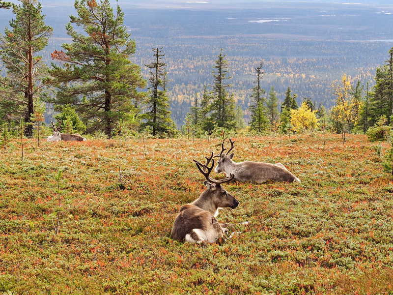 Etwas entfernt von mir sehe ich ein Paar, das am Rande des Wanderwegs steht und dauernd in Richtung der Ebene schaut, hm, ist die Aussicht von dort so viel besser als bisher, das kann ich mir gar nicht vorstellen. Aber ich blicke natürlich dann auch dorthin und kann erst nichts Besonderes erkennen – bis ich den Blick von der Ferne abwende und auf die Fläche direkt vor mir schaue- das was ich beim flüchtigen Darüberschauen für Felsbrocken und Holzstämme gehalten habe, sind nämlich sitzende und liegende Rentiere, perfekt getarnt, ohne das Paar hätte ich sie vielleicht übersehen, obwohl sie nur etwa 20 Meter entfernt vom Weg liegen. Ach wie toll, ich bin begeistert und beobachte die Tiere eine ganze Zeit lang, interessant wie manche den Kopf samt Geweih ganz auf den Boden senken, kann ich verstehen, so ein Geweih wiegt sicher so einiges. Im Allgäu /den deutschen Alpen gibt es den Spruch „wenn die Kühe liegen ist und bleibt das Wetter schlecht“, das gilt wohl auch für Rentiere in Finnland ;).
