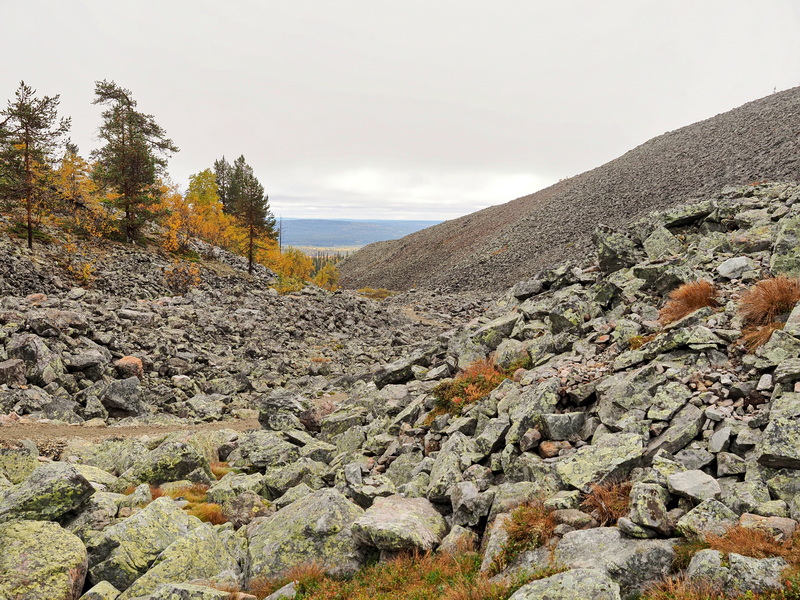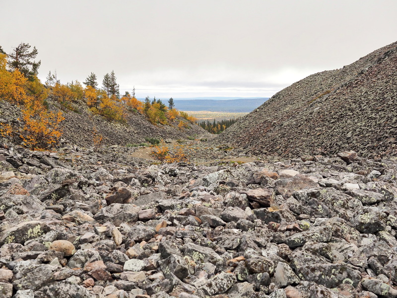 Zum Glück lichtet sich der Nebel nach und nach, die Umgebung nicht sehen zu können, wäre doch richtig schade. Denn der Pfad führt nun mitten durch eine Steinschlucht, links und rechts ragen geröllbedeckte Berghänge auf und in der Ferne ist der Blick in die weite Ebene schon zu erahnen.