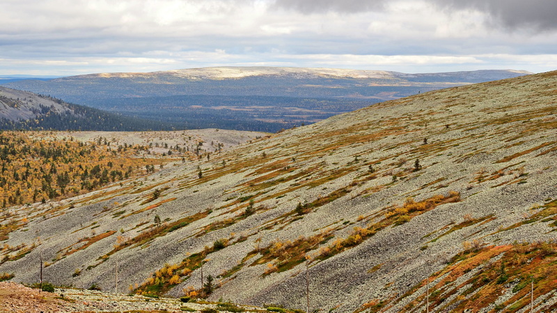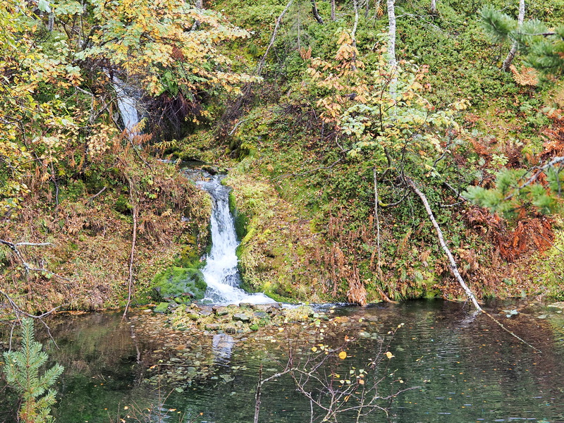 Am Ende der Schlucht geht es wieder leicht bergauf auf einem weiterhin gut zu gehenden Erdpfad, der nun durch die herbstlich bunte Vegetation führt. Immer wieder kommt die Sonne heraus und man kann den Blick von den benachbarten Berggipfeln bis über die wald- und seenreiche Ebene mit weiteren Bergen in der Ferne schweifen lassen – wunderschön.