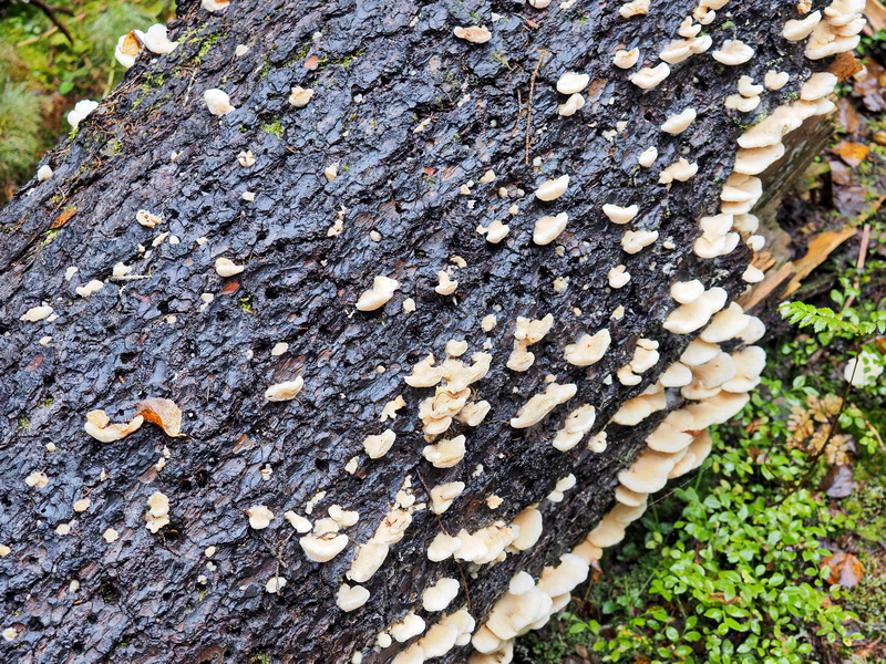 Zunächst führt mich der Weg leicht bergab durch den Wald und geht dann in eine herrlich grüne Schlucht über, die zum Schutz der Natur komplett mit Holz- und Metallbohlenwegen ausgebaut ist. Auch ohne Sonne ist es toll hier, überall plätschert es, Farne, Moos und Pilze wachsen in Massen und überwuchern jegliches Totholz. Sogar „Spanish Moss“, das ich aus den amerikanischen Südstaaten kenne, hängt hier an einigen Zweigen.