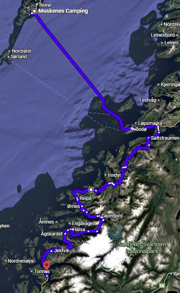 Auf der Fv17 müssen auch ein paar Fähren genutzt werden, die jedoch meist kostenlos sind. Bei uns waren es heute 2, wovon die letztere erst 18.15 Uhr abgelegt hat. (Seit Juli 2022 werden viele Fähren in Norwegen kostenlos angeboten. Dies soll die Lebensqualität in ländlichen Gebieten verbessern und den Zugang zu wichtigen Verkehrsrouten erleichtern)