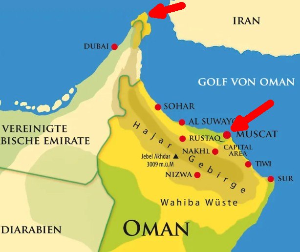 Jedenfalls legte das Schiff an zwei aufeinanderfolgenden Tagen in zwei Häfen im Oman an. Das liegt daran, dass der Oman durch das Hoheitsgebiet der Vereinigten Arabischen Emirate geteilt ist.
